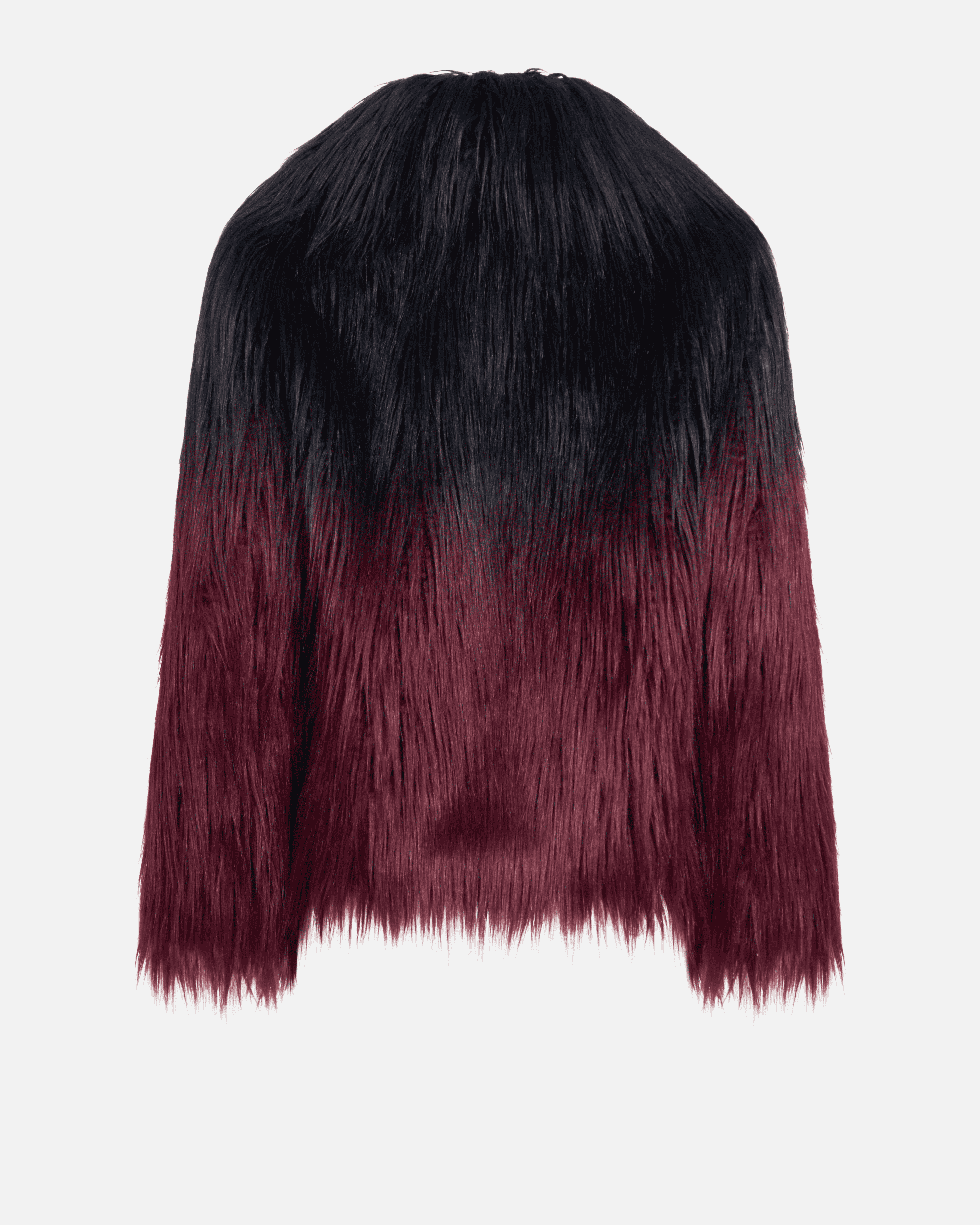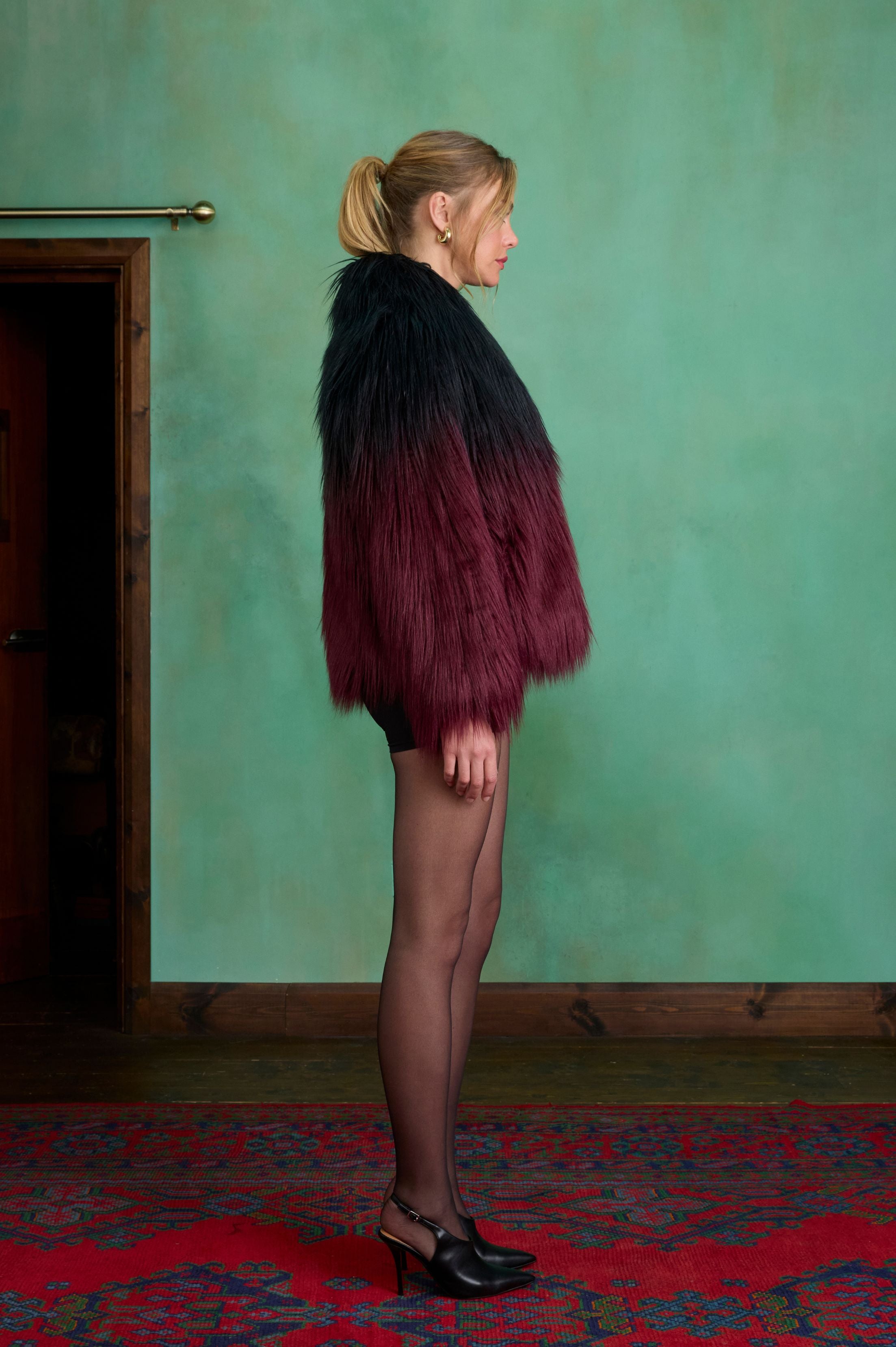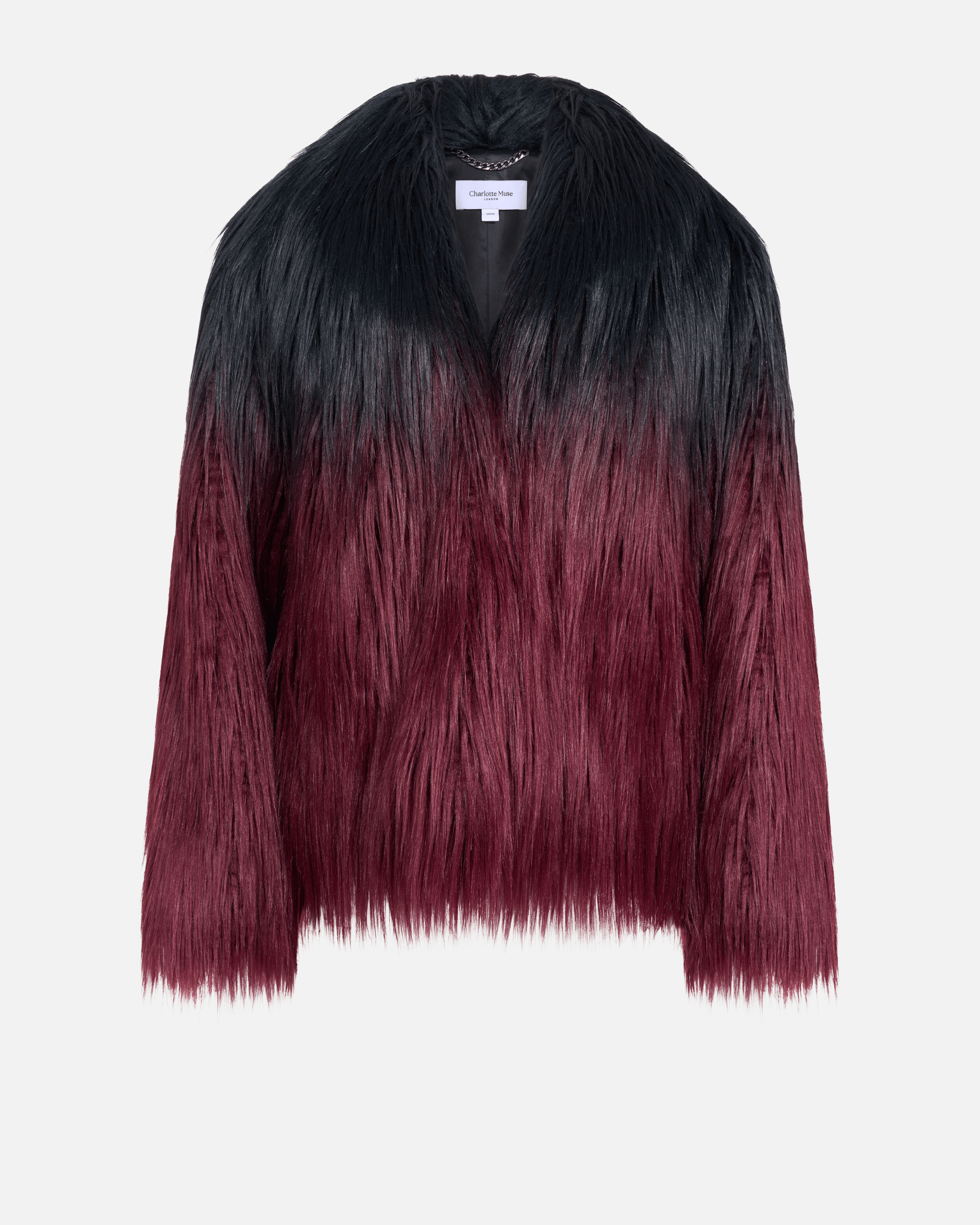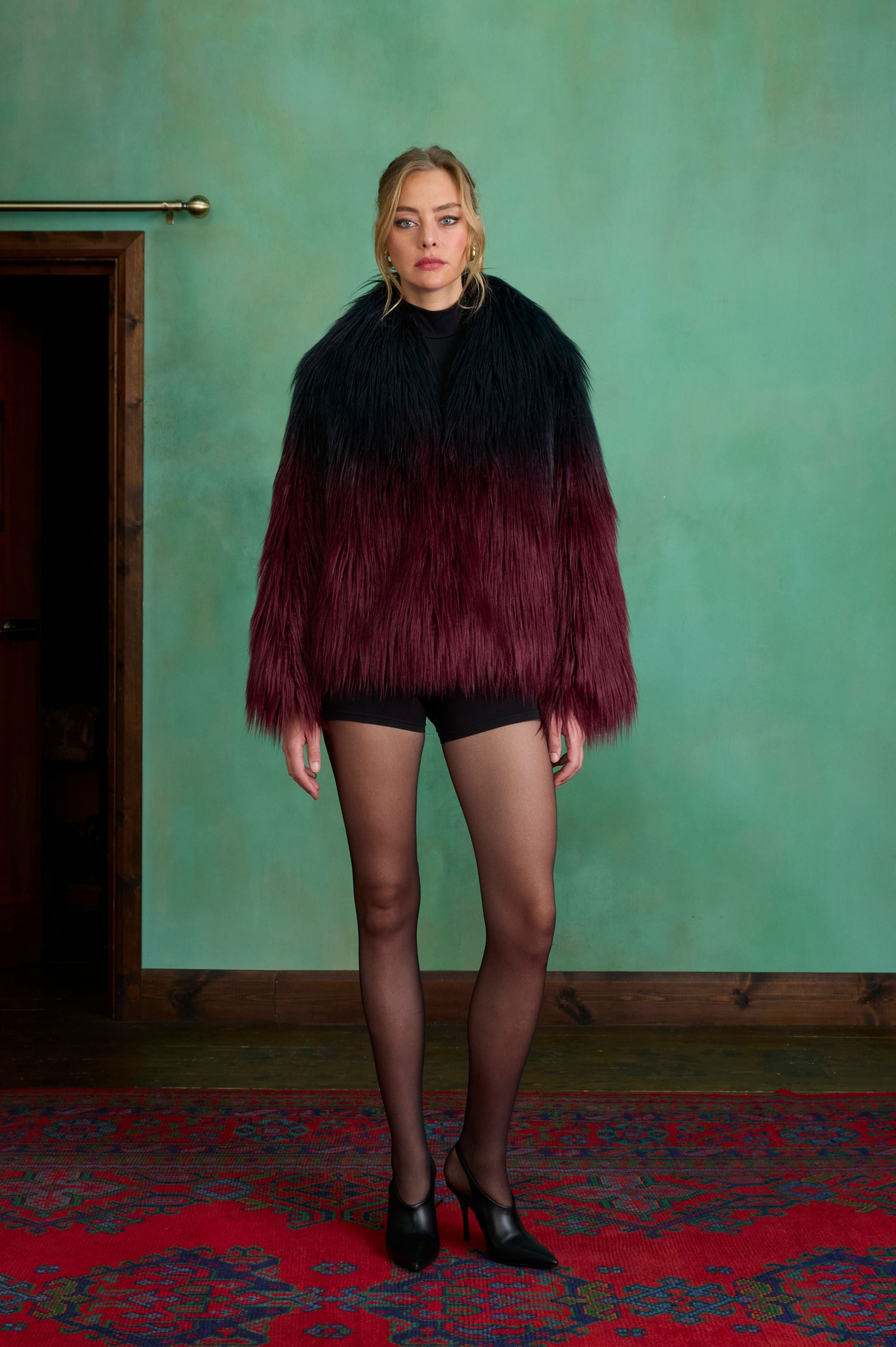 The Chiara Faux Fur Short Coat is a bold, high-concept piece blending deep black and rich burgundy in a luxurious two-tone gradient. Crafted from plush faux fur, its voluminous silhouette exudes confidence and mystery. Perfect for openings, premieres, or underground events, this coat embodies modern bohemian style with a luxe twist—unapologetic and unforgettable.
